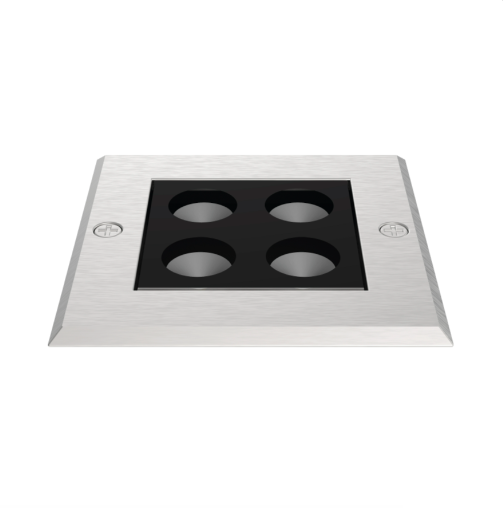 The HELMS recessed floor luminaire, with a finishing frame, is perfect for outdoor environments, projecting upward light. Made of injected aluminum with an exterior rim in 316L stainless steel, it features a transparent diffuser in tempered glass and is available only in stainless steel color. The ABS recessed box is included. IP67.